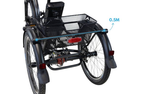 De accu van deze elektrische driewieler is voor uw boodschappenmand geplaatst. Hierdoor kunt u deze zonder te hoeven bukken, gemakkelijk uitnemen om eventueel binnen op te laden of aan de lader te zetten terwijl de accu zich nog in de fiets bevindt. De accu is standaard 324Wh sterk en dat zorgt ervoor dat u tot 40km ver kunt komen op één acculading, en dat is voor de meeste mensen meer dan genoeg. Om verder te komen adviseren wij de 504Wh te selecteren.